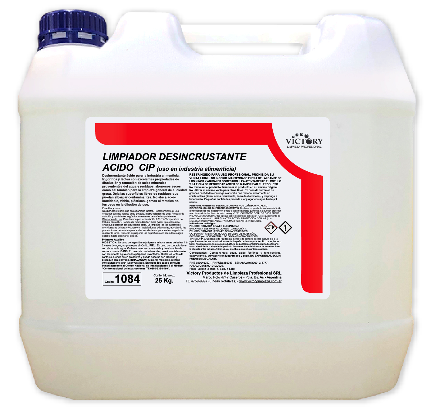 Limpiador desincrustante ácido base fosfórico de uso general en empresas de alimentos en general para limpieza de equipos y cañerías por sistema CIP. Apto para uso en acero inoxidable 304 y 316. No ataca plásticos ni gomas en las diluciones de uso.