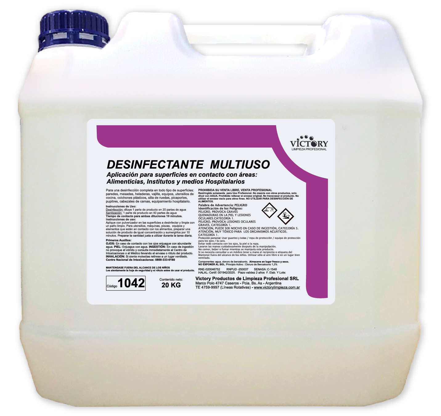 Desinfectante de superficies, base amonio cuaternario, para superficies que estén en contacto con: alimentos, establecimientos sanitarios e instituciones. De pH neutro y efecto residual.
